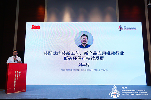 受論壇邀請,中裝建設副總工程師劉豐鈞以《裝配式內裝新工藝、新產品應用推動行業低碳環保可持續發展》為主題做大會報告。